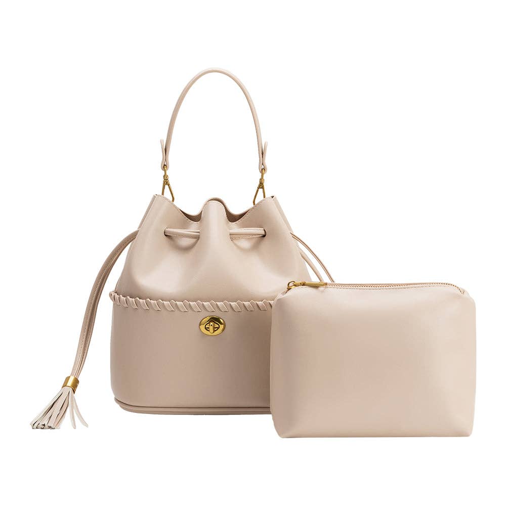 The Janae Bone Top Handle Bag is a versatile essential crafted from recycled vegan leather with thoughtful details that elevate everyday style. Featuring a distinctive whipstitch-detailed front pocket, tassel drawstring closure, and structured flat bottom, this bag transitions seamlessly from handheld to crossbody with its detachable top handles and convertible long strap. Interior slip pocket and removable zip pouch keep essentials organized, while gold-tone hardware and nested feet add refined touches. At 10"W x 10.5"H x 6"D, it accommodates an iPhone 17 Pro and fits your daily necessities with room to spare. Perfect for the modern woman who values both style and sustainability.