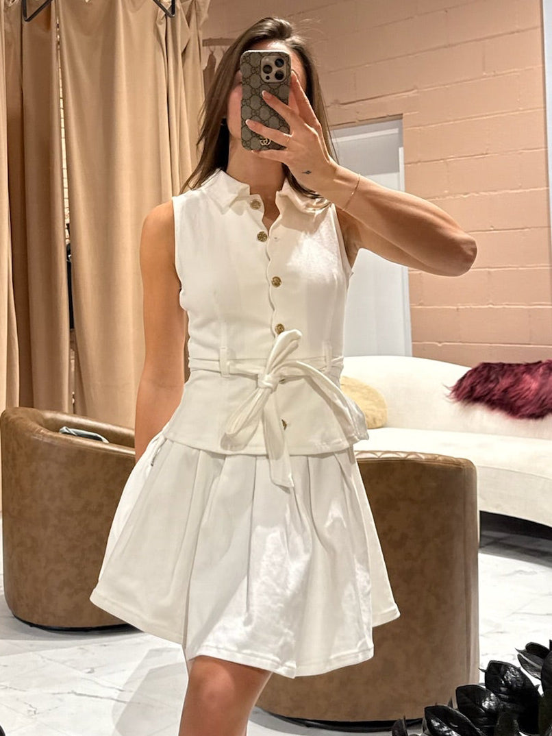 Discover the perfect blend of comfort and style with the Alix denim mini dress! Made from 97% cotton and 3% spandex, this stunning dress features a scallop placket and a button front for a tailored look. The sleeveless design and collars add a touch of elegance, while the belt cinches your waist for a flattering silhouette. Effortlessly capture a chic and sophisticated look with this dress that looks like a skirt and top in one!