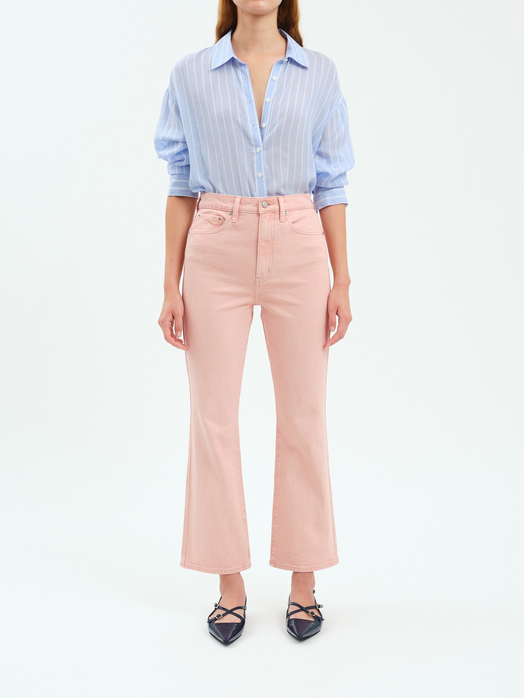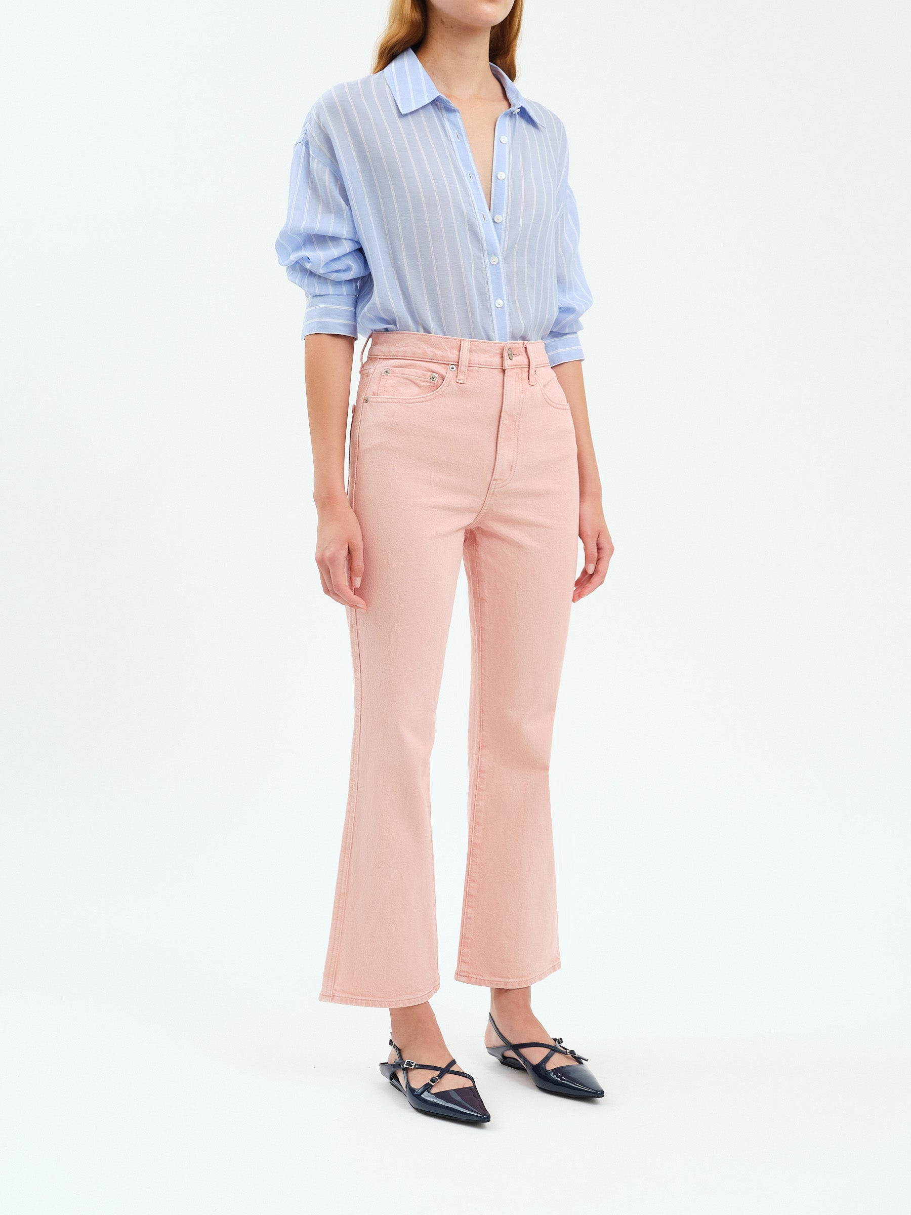 Introducing the Soho High Rise Ankle Flare—a timeless silhouette with modern appeal. Crafted in a soft rosewater pink, this structured flare features an ultra-high 11¾" rise that flatters and elongates. The 28½" inseam with an 18" leg opening creates that coveted vintage-inspired flare shape. Made from our signature Just Right denim, it balances rigid structure with subtle stretch for all-day comfort and confidence. A versatile essential that transitions effortlessly from casual to dressed-up looks.