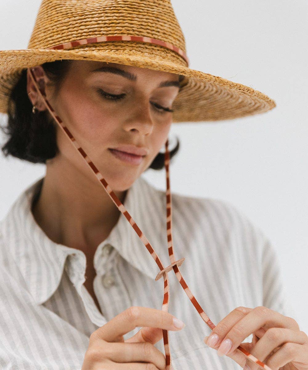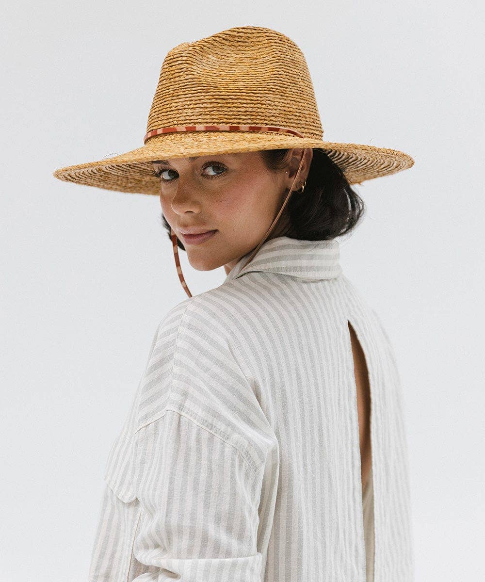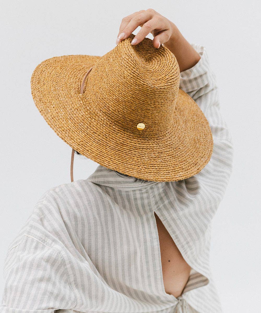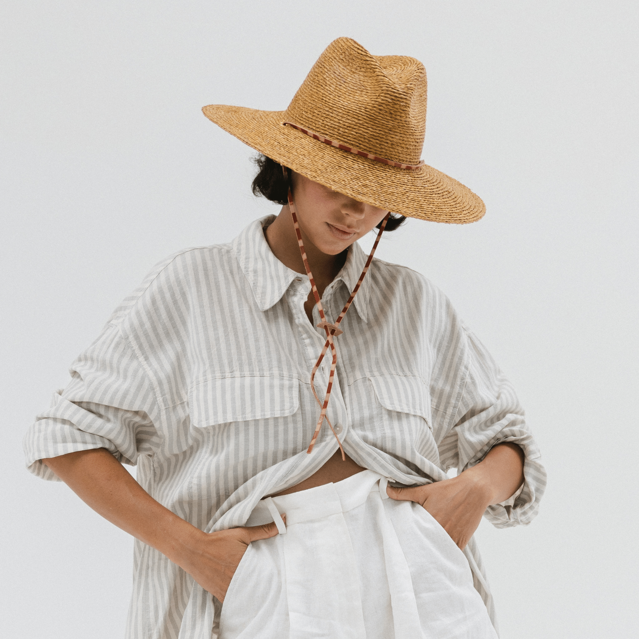 Keep the sun rays at bay with our raffia straw Ozzy lifeguard hat. the relaxed a-line wide brim with a hand-painted leather chinstrap is both aesthetic + functional. The tight straw weave is ideal for sun protection during any adventure + the natural straw color pairs wonderfully with any vibe from subtle to bold. This hat will inspire you to get outdoors, just so you can take Ozzy along.