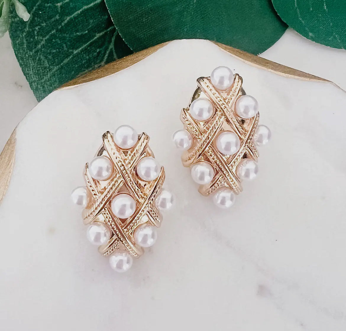 These charming Monroe weave earrings blend timeless vintage appeal with modern comfort. Featuring a classic checked pattern accented with lustrous pearl and gold details, they're designed to elevate any look without weighing you down. The super lightweight construction makes them perfect for all-day wear, whether you're heading to the office or out for an evening. A versatile piece that brings understated elegance to your jewelry collection.