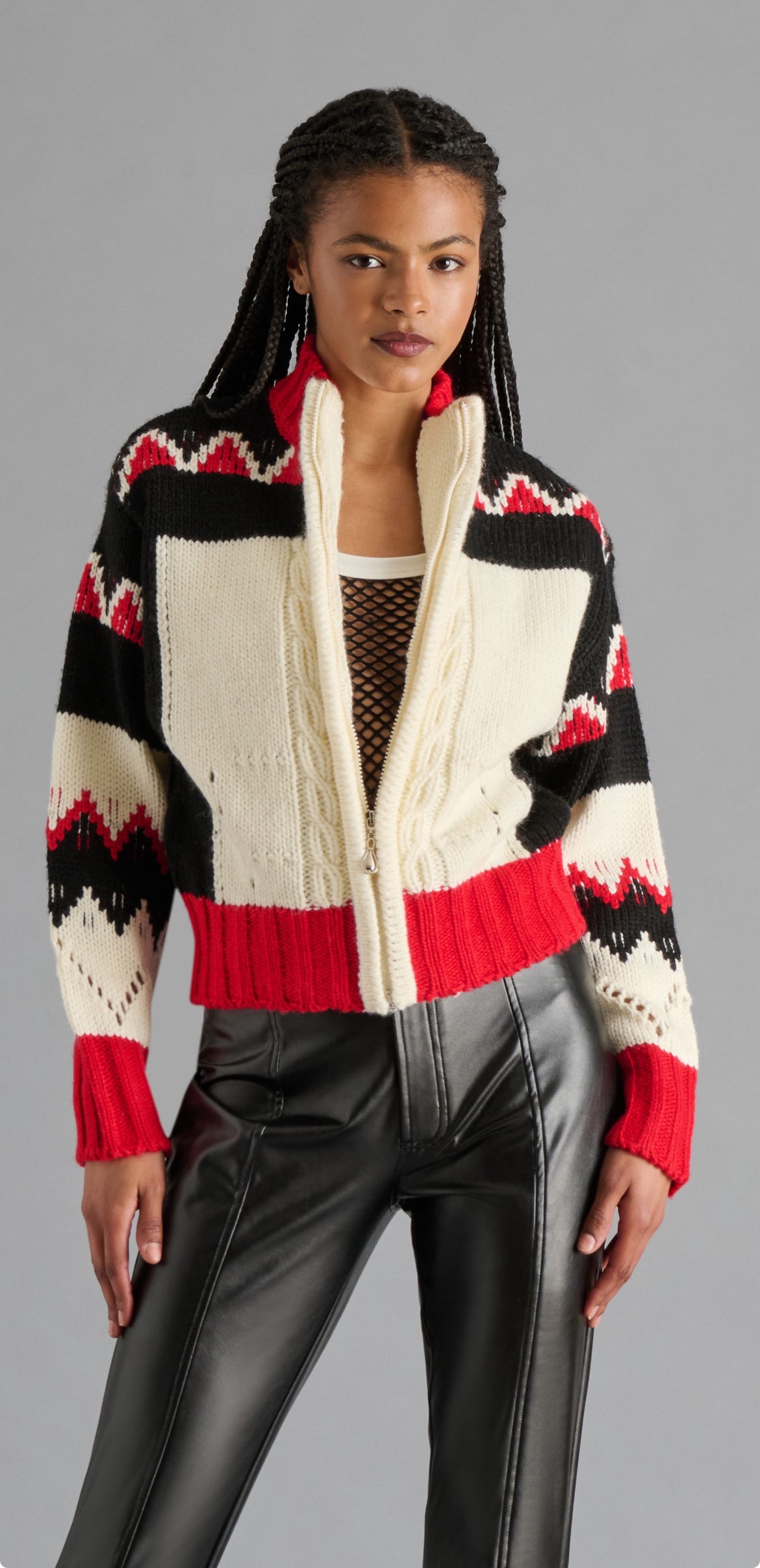 The Averia sweater jacket combines cozy comfort with stylish details. This cream-colored cardigan features a bold red and black pattern and charming cable knit accents. Its mock neck design adds warmth and a touch of sophistication, making it perfect for layering on cool days. The zip closure offers easy wear and versatility for any outfit. Ideal for staying comfortable while looking effortlessly chic.