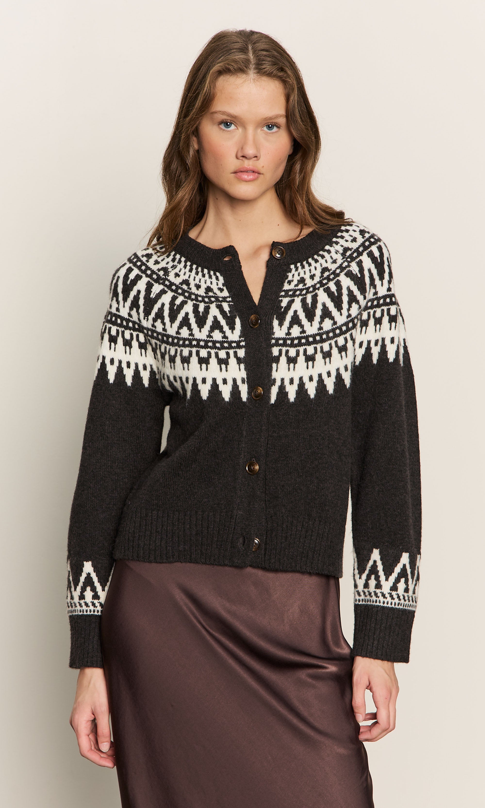Elevate your wardrobe with this Fairisle crewneck cardigan, featuring a button-front design and ribbed cuffs for refined detailing. Crafted with a relaxed fit, it offers effortless comfort while maintaining a polished look. Made from sustainably sourced materials, this cardigan blends timeless style with eco-conscious craftsmanship.