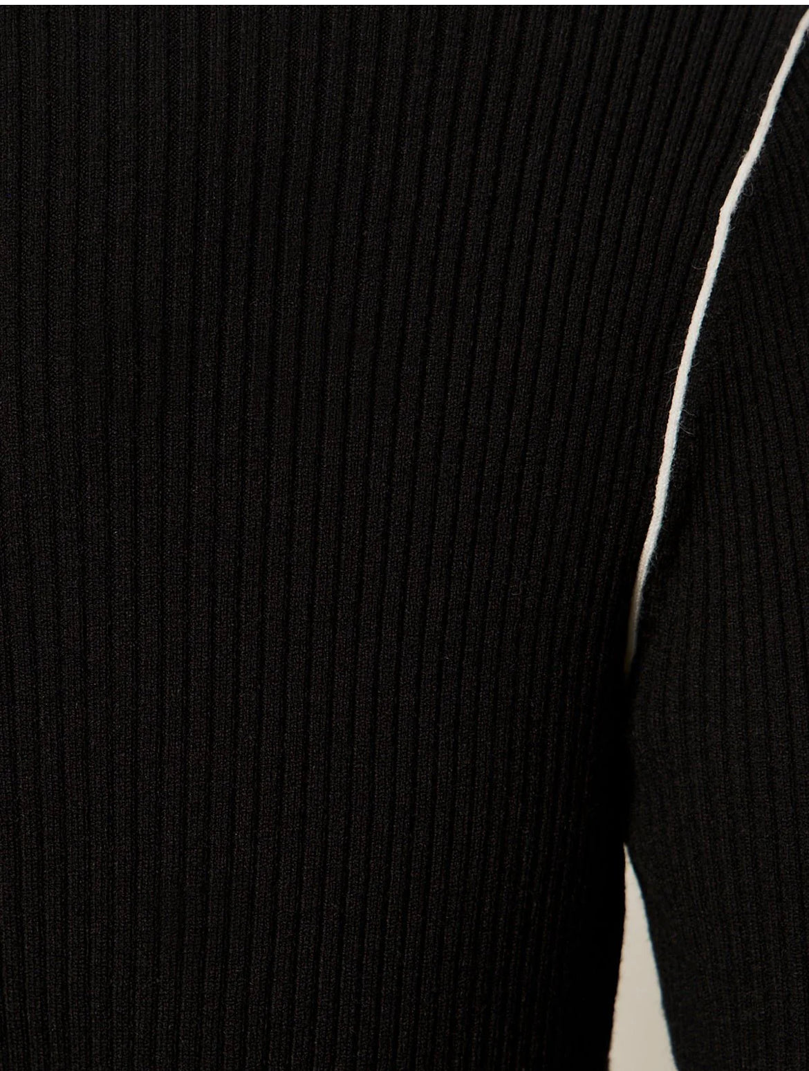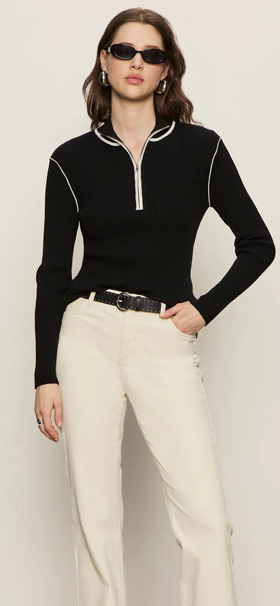 Elevate your layering game with this sleek sporty rib zip up. Crafted with a fitted silhouette and ribbed texture, it features a classic half-zip collar perfect for easy adjustments throughout your day. The cream trim detailing adds a refined touch to the black base, making it versatile enough to pair with everything in your wardrobe. Whether you're layering for warmth or style, this piece delivers both comfort and sophistication.