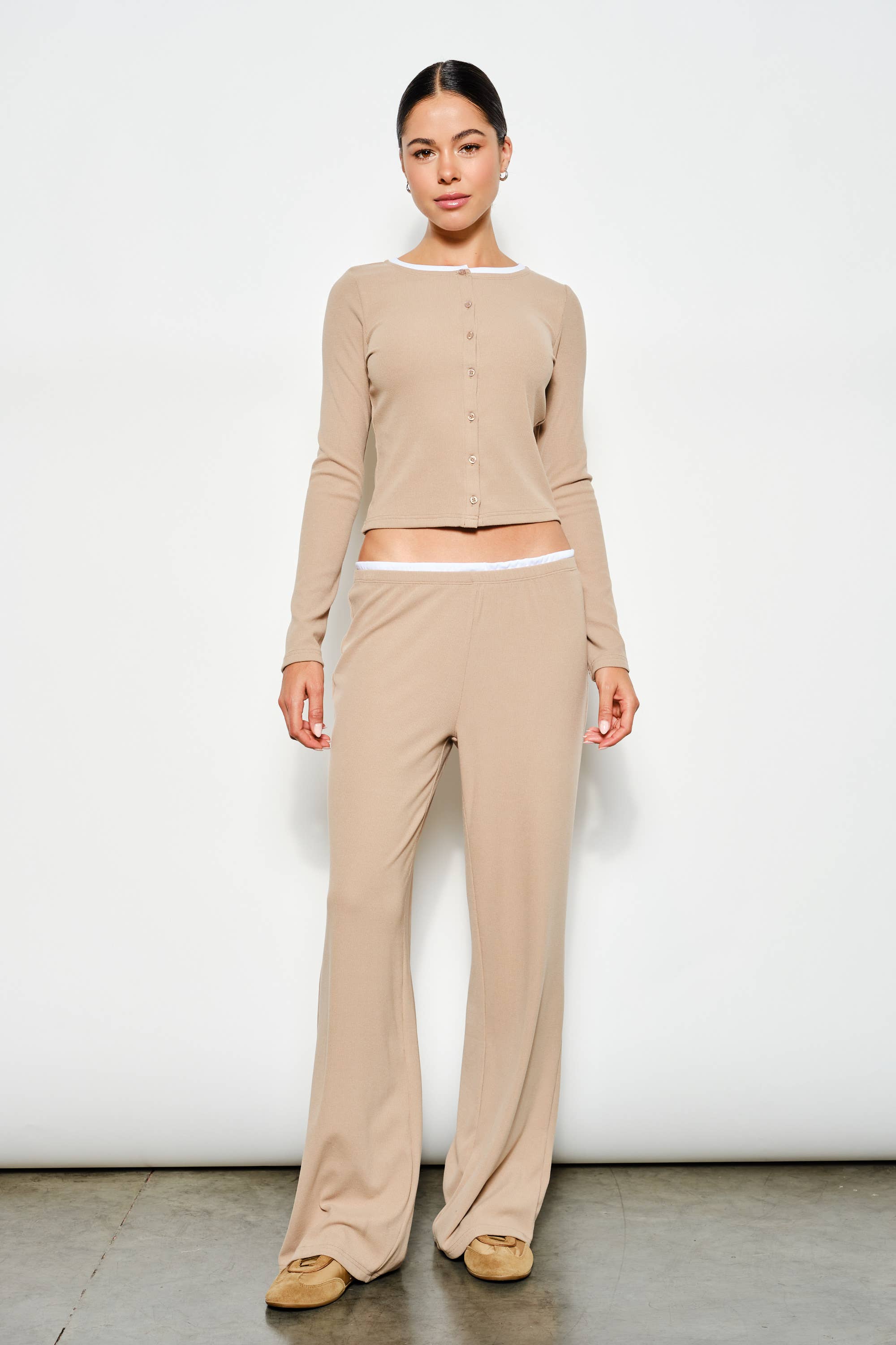 Comfort and style come together in the Sunny Ribbed Pants in mocha. Crafted from soft, stretchy ribbed knit with an elasticized waistband and playful contrast detail, these pants deliver an effortless, flattering silhouette that works from morning to night. The relaxed fit keeps you cozy whether you're unwinding at home or stepping out, while the modern design pairs beautifully with the matching Sunny top for a coordinated, put-together look that feels both casual and intentional.