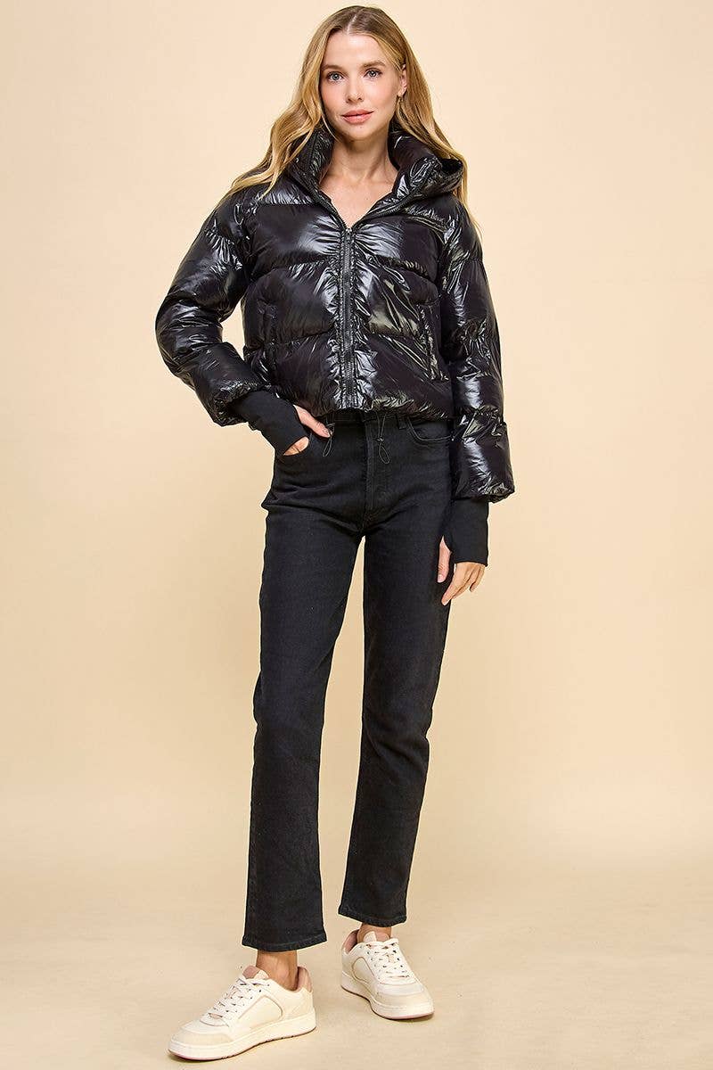 Stay cozy and stylish in this solid hooded puffer jacket, designed with practical details for everyday wear. The front zipper closure, side pockets, and adjustable drawstring hood keep you comfortable and secure, while the convenient thumb hole opening on the sleeves adds an extra layer of warmth. Note: This jacket runs small, so we recommend sizing up for the perfect fit.